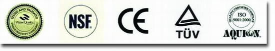 Aquion obtained certificates from domestic and foreign authoritative approval organizations such as NSF, WQA, CE, TUV, and ISO 9001~2000 etc. and each product passed through firm test for best quality, best performance and high durability.